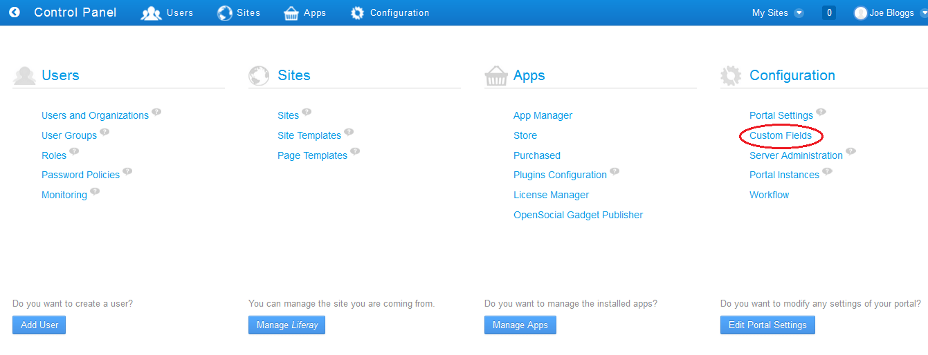 Let’s explore how to add custom fields through UI. You need to login to your portal as Admin. Go to your control panel. Click Custom Fields as shown in red color in below picture.